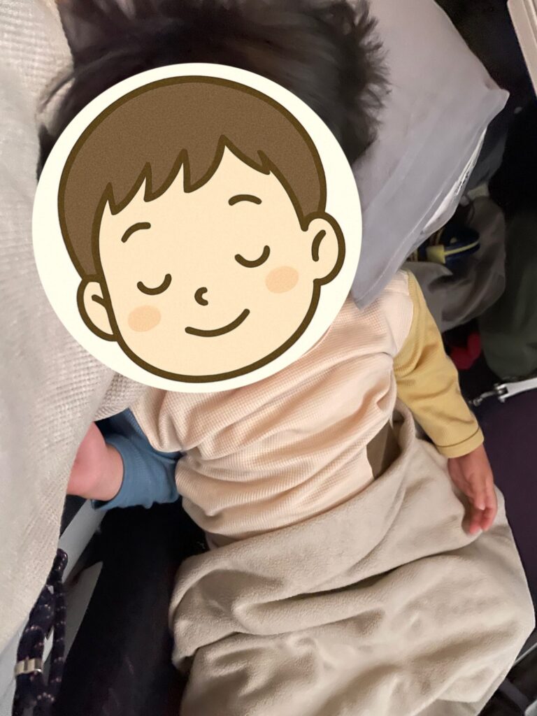 みろかかの膝+枕で寝ていたので、みろかか自身はほとんど身動きがとれなかったけど…寝てくれていたほうが平和なのでなんとか起こさないようにこっちも必死。今回は機体最後部で、トイレに行く人たちで通路の往来はひっきりなしだったけれど、音もきにせずよく寝てくれました。